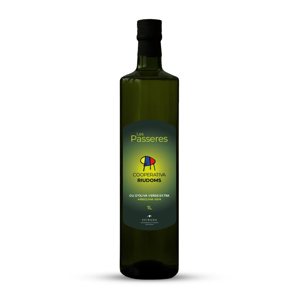 Oli d’oliva verge extra 100% arbequina de la Cooperativa de Riudoms. Extracció en fred i només procediments mecànics, perfil suau i equilibrat.