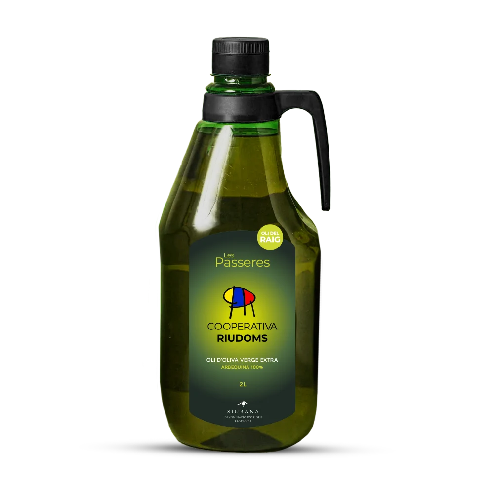 Oli d’oliva verge extra 100% arbequina de la Cooperativa de Riudoms. Extracció en fred i només procediments mecànics, perfil suau i equilibrat. Format 2 L pràctic per a la llar i cuina diària. Origen DOP Siurana.
